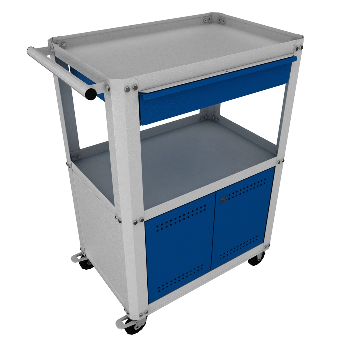 – Capacidade de carga distribuída de 15 kg por gavetas e 50kg no compartimento com porta. Capacidade total do carrinho 120kg distribuídos.